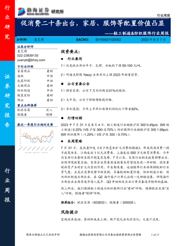 【渤海证券】【20230807】20230807-渤海证券-轻工制造&纺织服饰行业周报:促消费二十条出台,家居、服饰等配置价值凸显-15页