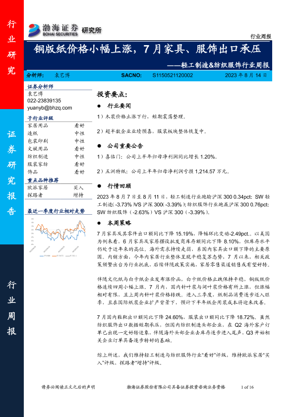 【渤海证券】【20230814】20230814-渤海证券-轻工制造&纺织服饰行业周报:铜版纸价格小幅上涨,7月家具、服饰出口承压-16页