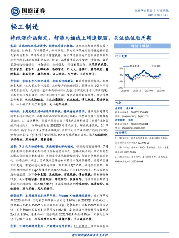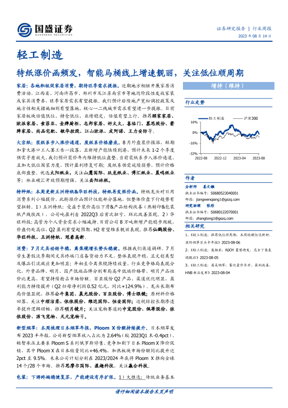 【国盛证券】【20230814】20230814-国盛证券-轻工制造行业周报:特纸涨价函频发,智能马桶线上增速靓丽,关注低位顺周期-43页
