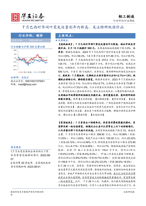 【华安证券】【20230814】20230814-华安证券-轻工制造行业周报:7月巴西对华阔叶浆发运量创年内新高,关注特种纸涨价函-31页