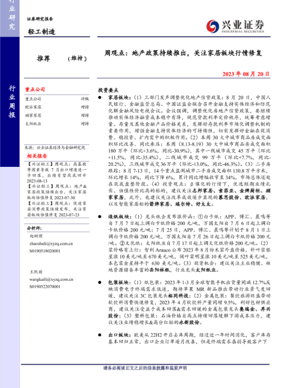 【兴业证券】【20230820】20230820-兴业证券-轻工制造周观点:地产政策持续推出,关注家居板块行情修复-23页