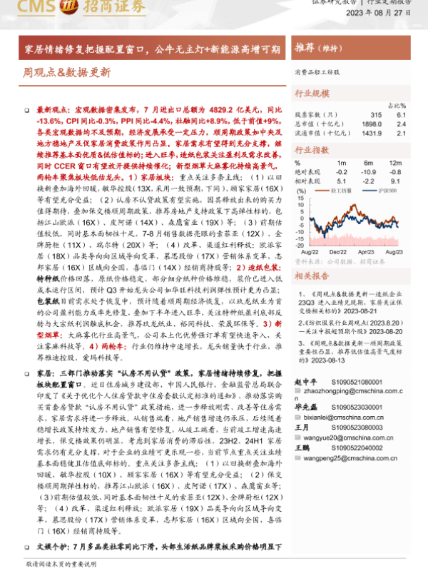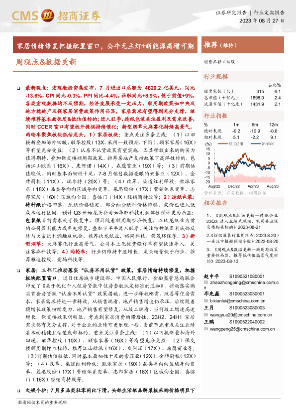 【海通证券】【20230827】20230827-招商证券-消费品轻工纺服周观点&数据更新:家居情绪修复把握配置窗口,公牛无主灯+新能源高增可期-29页