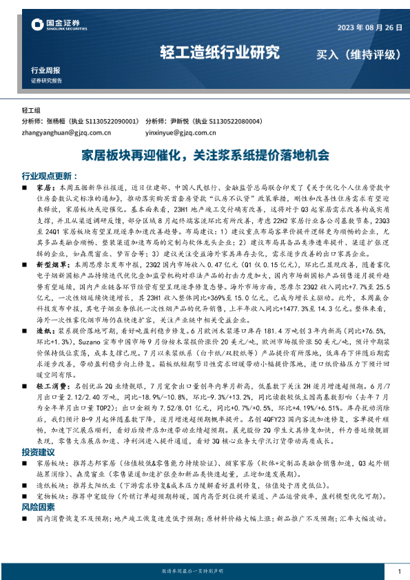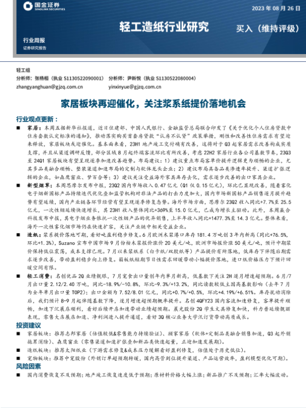 【国金证券】【20230826】20230826-国金证券-轻工造纸行业研究:家居板块再迎催化,关注浆系纸提价落地机会-16页