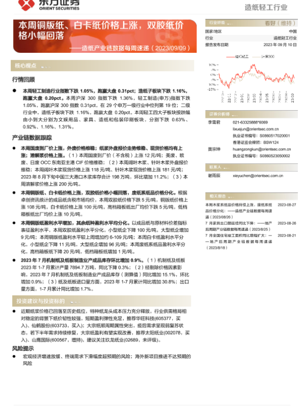 【东方证券】【20230910】20230910-东方证券-造纸轻工行业造纸产业链数据每周速递:本周铜版纸、白卡纸价格上涨,双胶纸价格小幅回落-12页