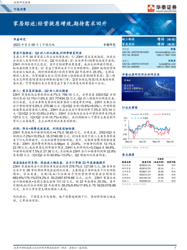 【华泰证券】【20230908】家居综述 经营提质增效,期待需求回升-18页