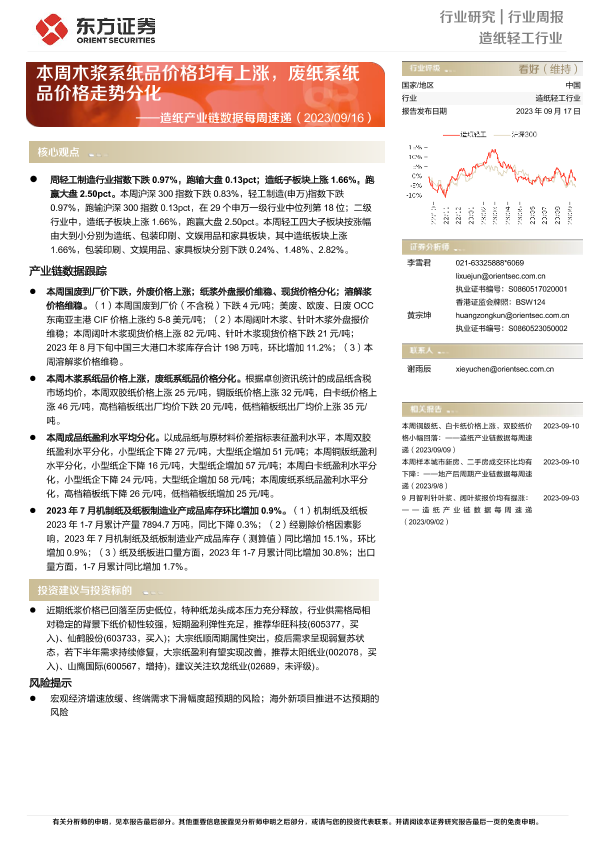 【东方证券】【20230917】20230917-东方证券-造纸产业链数据每周速递:本周木浆系纸品价格均有上涨,废纸系纸品价格走势分化-12页