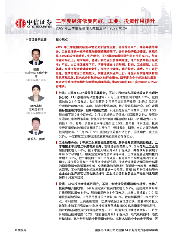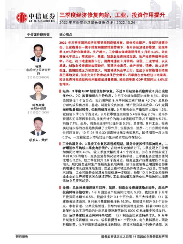 【中信证券】【20221024】2022年三季度经济增长数据点评:三季度经济修复向好,工业、投资作用提升-15页