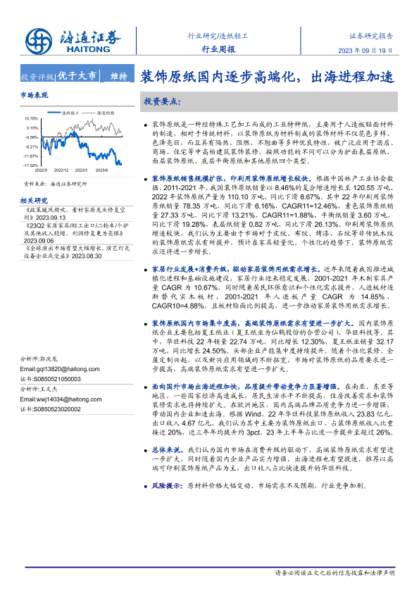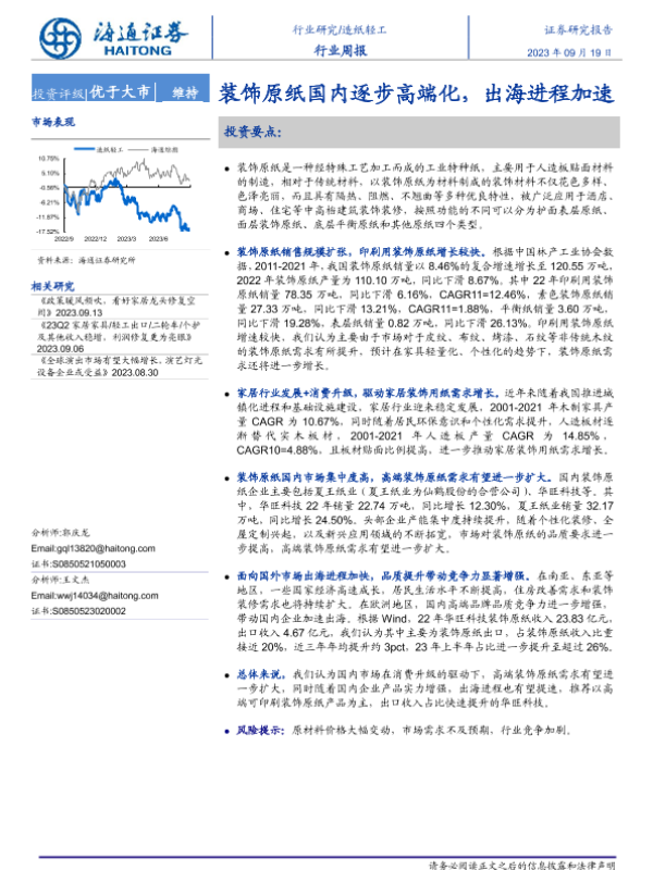【海通证券】【20230919】20230919-海通证券-造纸轻工行业周报:装饰原纸国内逐步高端化,出海进程加速-11页