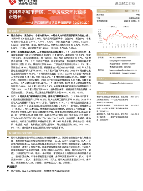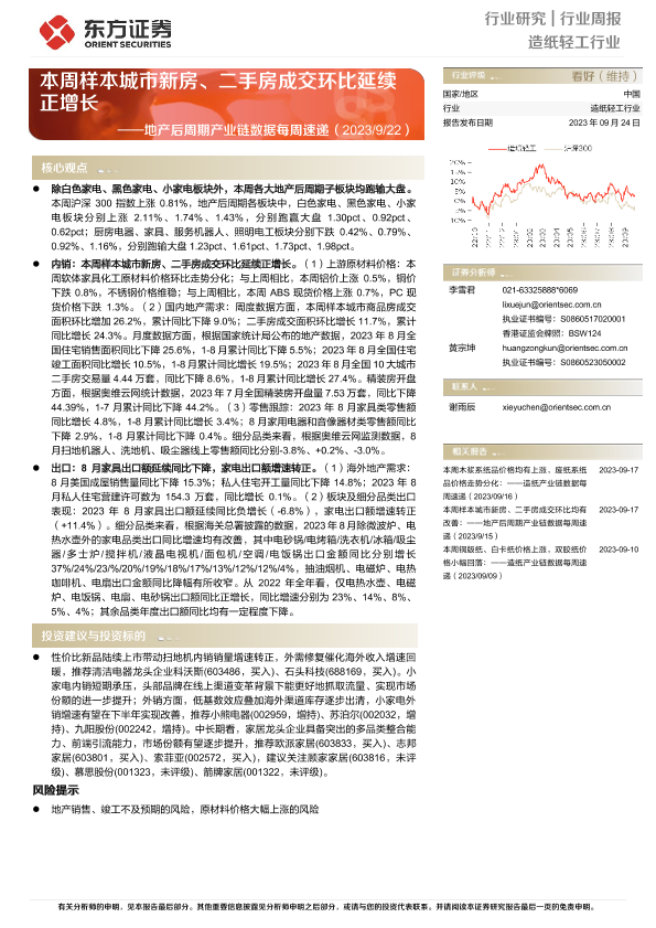 【东方证券】【20230924】20230924-东方证券-造纸轻工行业:地产后周期产业链数据每周速递-本周样本城市新房、二手房成交环比延续正增长-15页