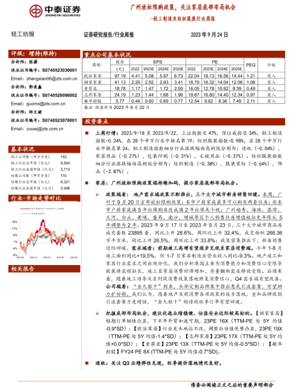 【中泰证券】【20230924】轻工制造及纺织服装行业周报:广州放松限购政策,关注家居底部布局机会-19页