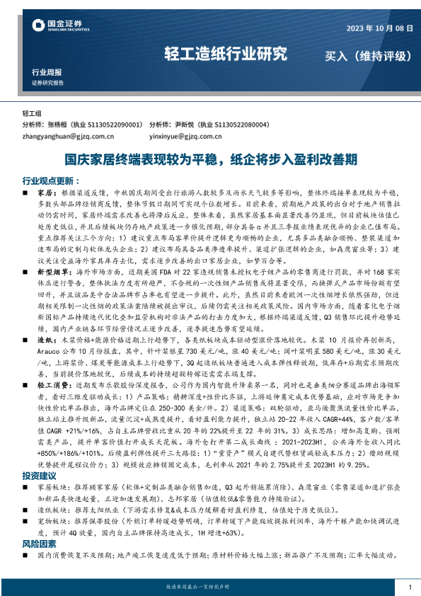 【国金证券】【20231008】20231008-国金证券-轻工造纸行业周报:国庆家居终端表现较为平稳,纸企将步入盈利改善期-16页