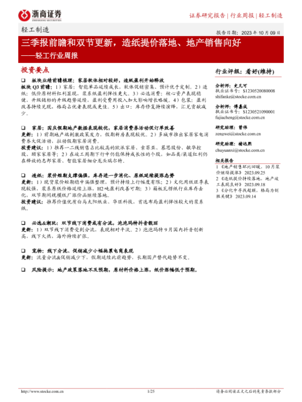 【浙商证券】【20231009】20231009-浙商证券-轻工行业周报:三季报前瞻和双节更新,造纸提价落地、地产销售向好-25页