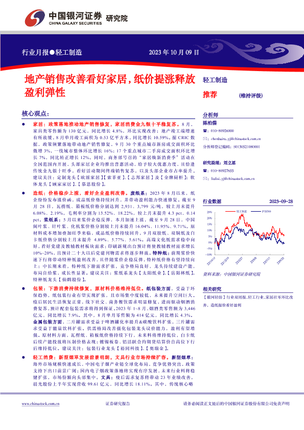 【银河证券】【20231009】轻工制造行业月报:地产销售改善看好家居,纸价提涨释放盈利弹性-19页