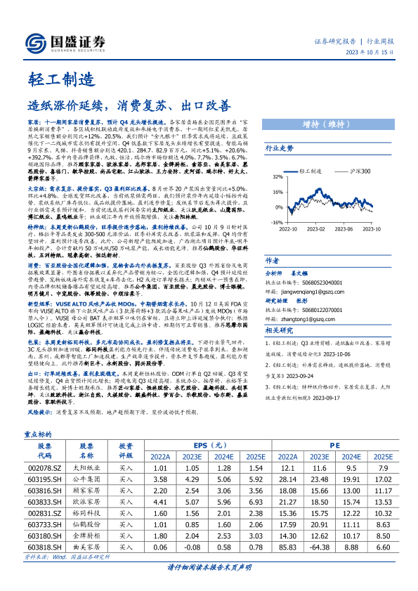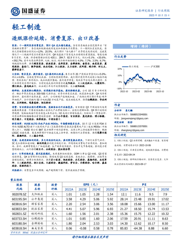 【国盛证券】【20231015】20231015-国盛证券-轻工制造行业周报:造纸涨价延续,消费复苏、出口改善-44页