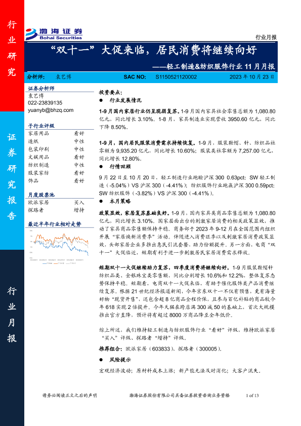 【渤海证券】【20231023】轻工制造&纺织服饰行业11月月报:“双十一”大促来临,居民消费将继续向好-13页