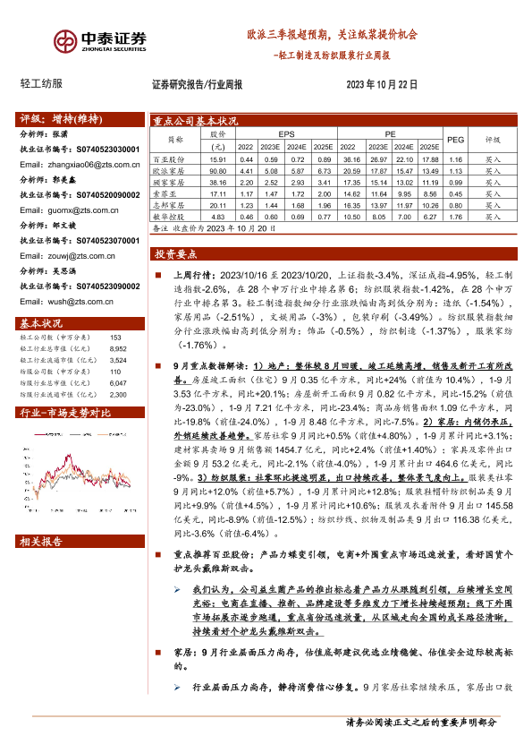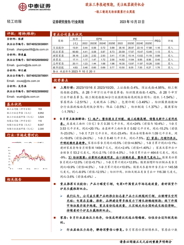 【中泰证券】【20231022】轻工制造及纺织服装行业周报:欧派三季报超预期,关注纸浆提价机会-23页
