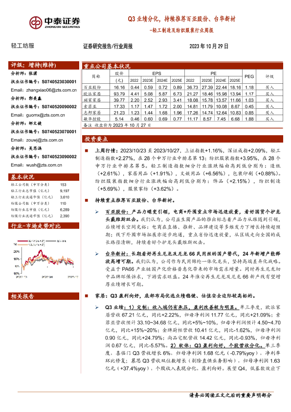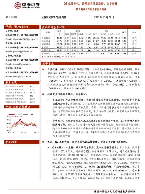 【中泰证券】【20231029】20231029-中泰证券-轻工制造及纺织服装行业周报:Q3业绩分化,持续推荐百亚股份、台华新材-24页