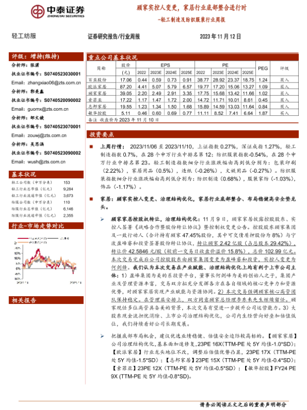 【中泰证券】【20231112】20231112-中泰证券-轻工制造及纺织服装行业周报:顾家实控人变更,家居行业底部整合进行时-23页