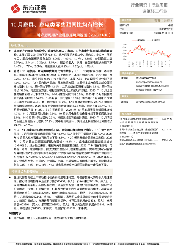 【东方证券】【20231119】20231119-东方证券-造纸轻工行业地产后周期产业链数据每周速递:10月家具、家电类零售额同比均有增长-15页