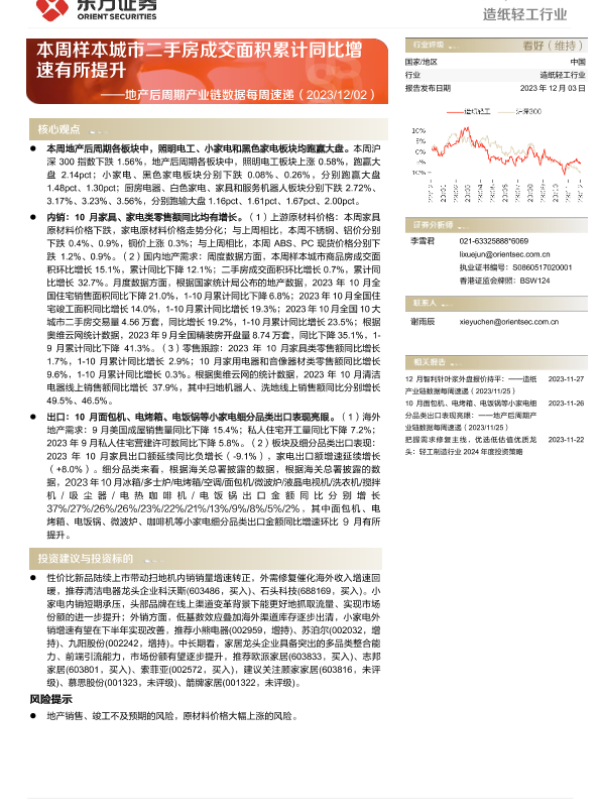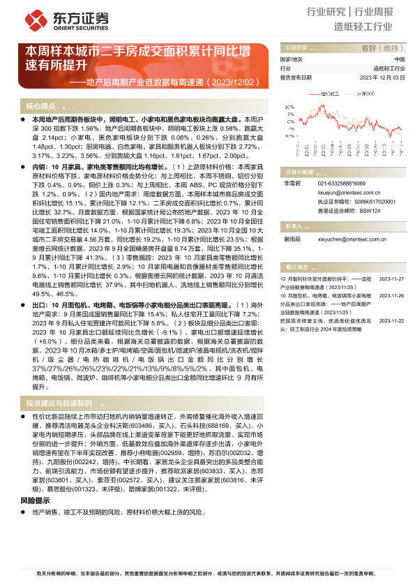 【东方证券】【20231203】20231203-东方证券-造纸轻工行业:地产后周期产业链数据每周速递-本周样本城市二手房成交面积累计同比增速有所提升-15页