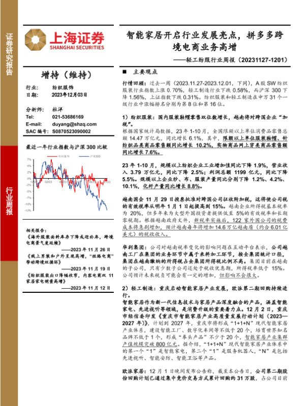 【上海证券】【20231204】轻工纺服行业周报:智能家居开启行业发展亮点,拼多多跨境电商业务高增-10页