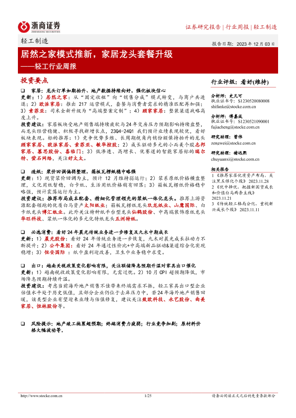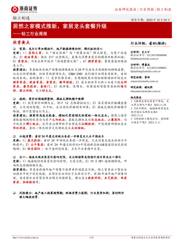 【浙商证券】【20231203】20231203-浙商证券-轻工行业周报:居然之家模式推新,家居龙头套餐升级-25页