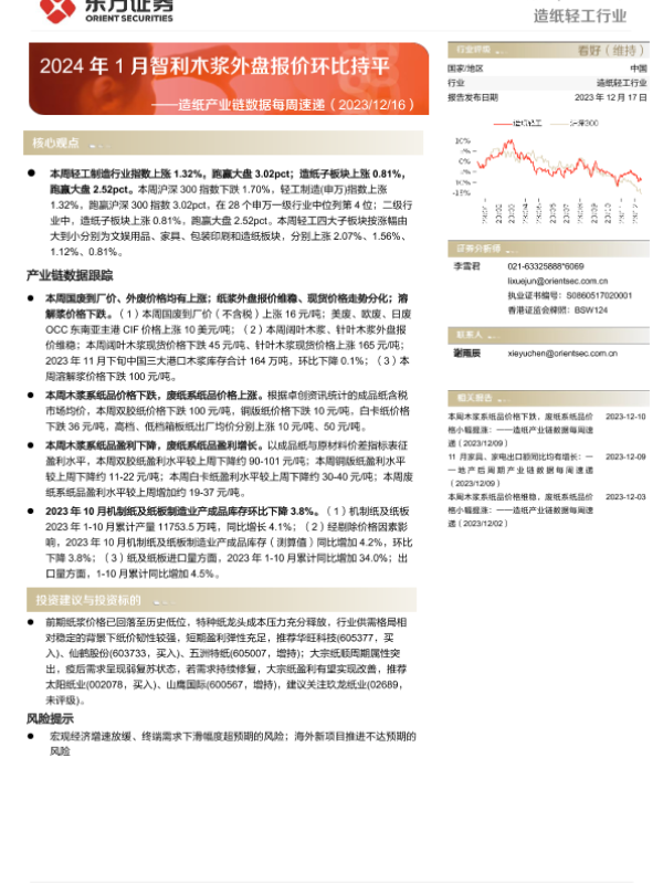 【东方证券】【20231217】20231217-东方证券-造纸产业链数据每周速递:2024年1月智利木浆外盘报价环比持平-12页