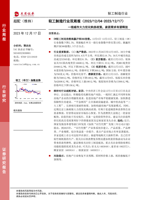 【东莞证券】【20231217】20231217-东莞证券-轻工制造行业双周报:一线城市大力优化购房政策,家居需求有望释放-13页
