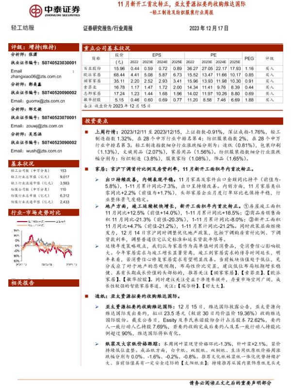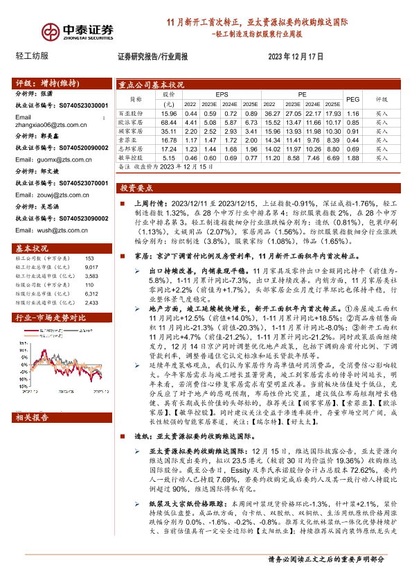 【中泰证券】【20231217】轻工制造及纺织服装行业周报:11月新开工首次转正,亚太资源拟要约收购维达国际-22页