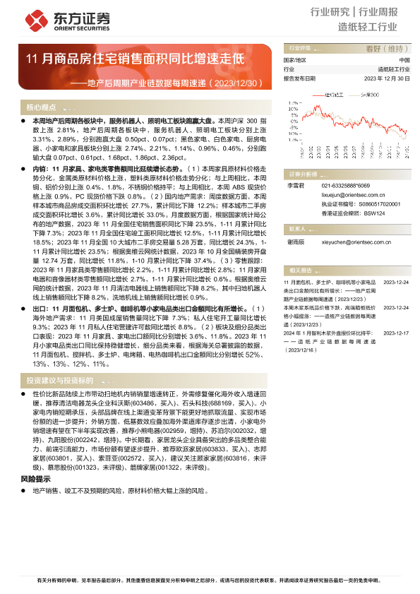 【东方证券】【20231230】20231230-东方证券-造纸轻工行业地产后周期产业链数据每周速递:11月商品房住宅销售面积同比增速走低-15页
