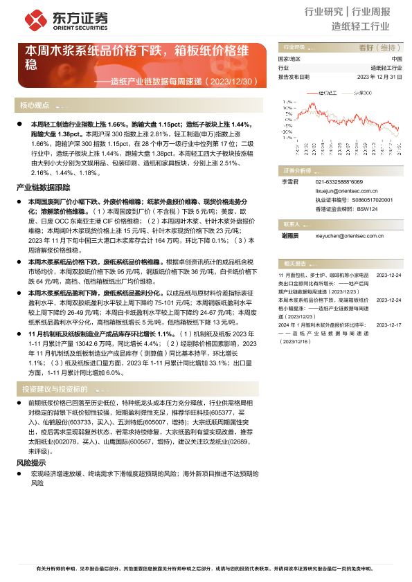 【东方证券】【20231231】20231231-东方证券-造纸产业链数据每周速递:本周木浆系纸品价格下跌,箱板纸价格维稳-12页