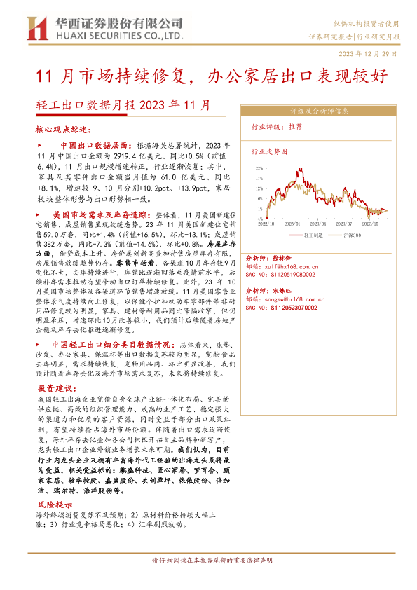 【华西证券】【20231229】2023年11月轻工出口数据月报:11月市场持续修复,办公家居出口表现较好-14页