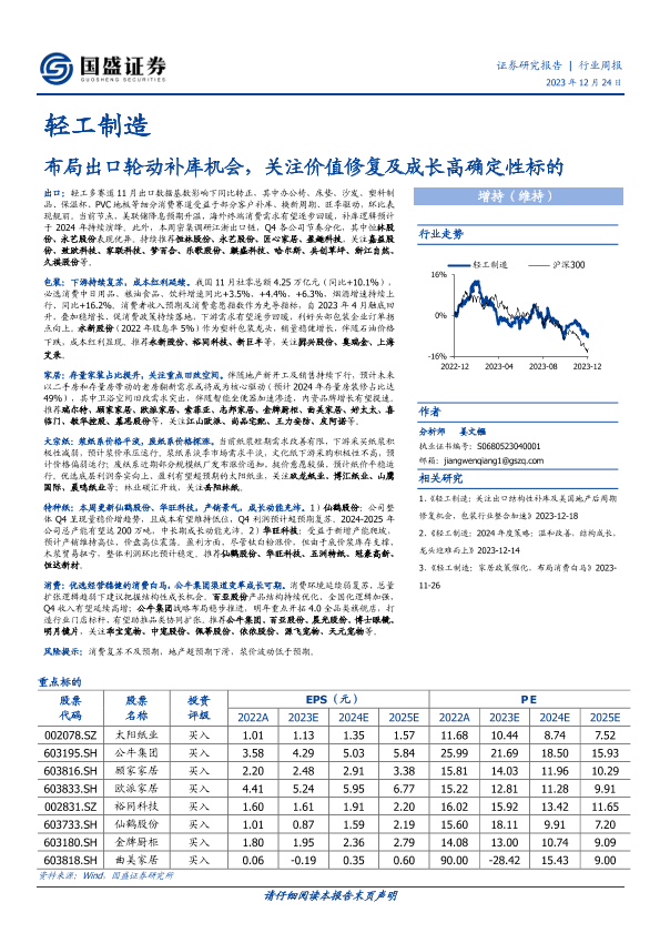 【国盛证券】【20231224】20231224-国盛证券-轻工制造行业周报:布局出口轮动补库机会,关注价值修复及成长高确定性标的-40页