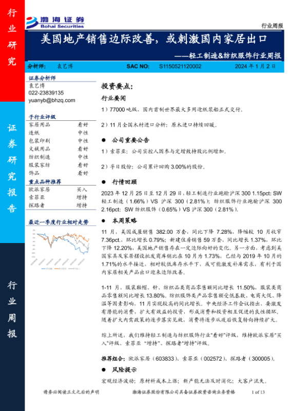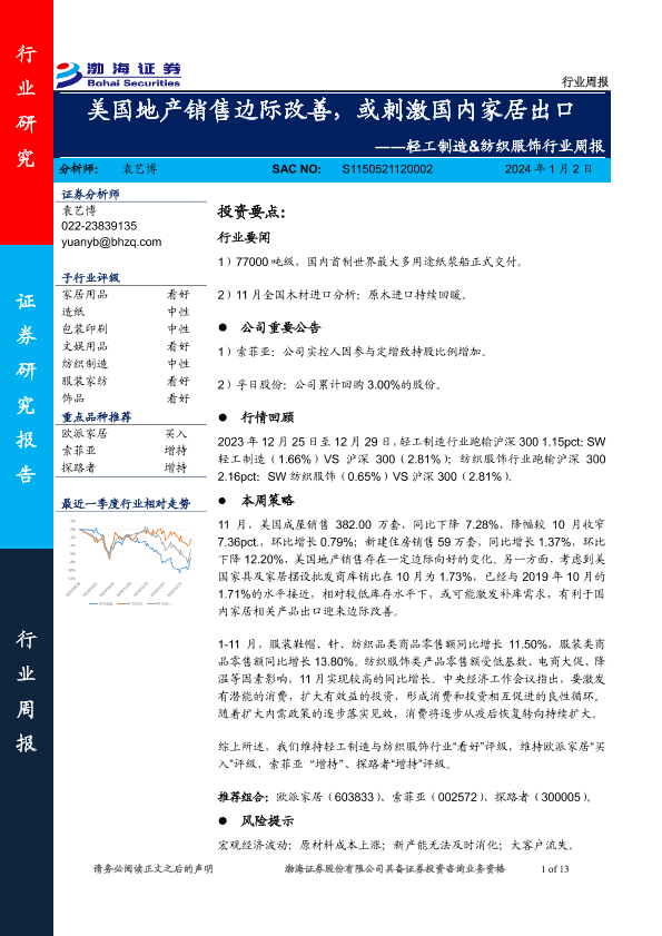 【渤海证券】【20240102】20240102-渤海证券-轻工制造&纺织服饰行业周报:美国地产销售边际改善,或刺激国内家居出口-13页