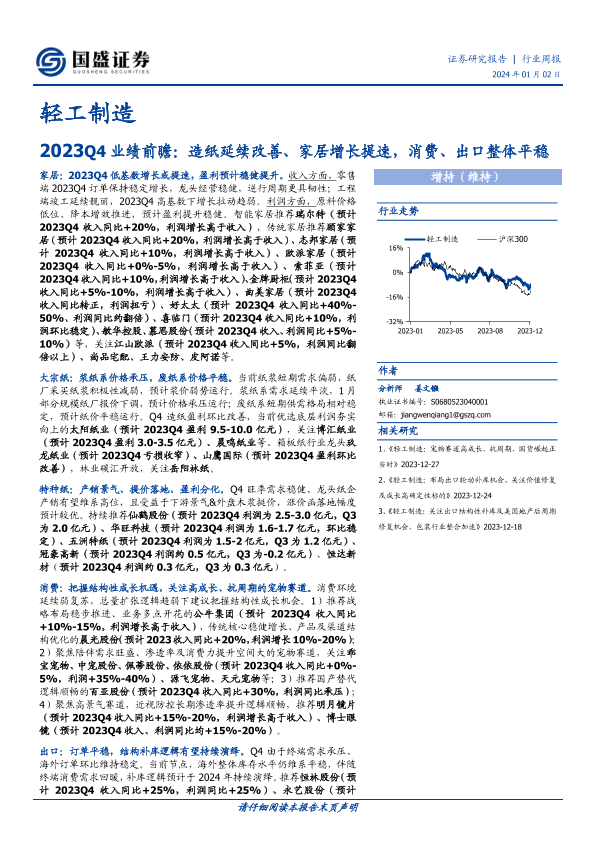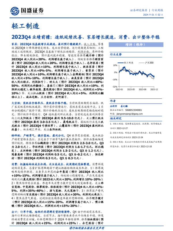 【国盛证券】【20240102】20240102-国盛证券-轻工制造行业周报:2023Q4业绩前瞻:造纸延续改善、家居增长提速,消费、出口整体平稳-49页