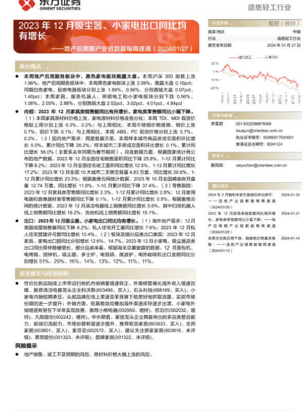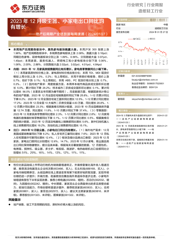 【东方证券】【20240127】20240127-东方证券-造纸轻工行业:地产后周期产业链数据每周速递-2023年12月吸尘器、小家电出口同比均有增长-15页