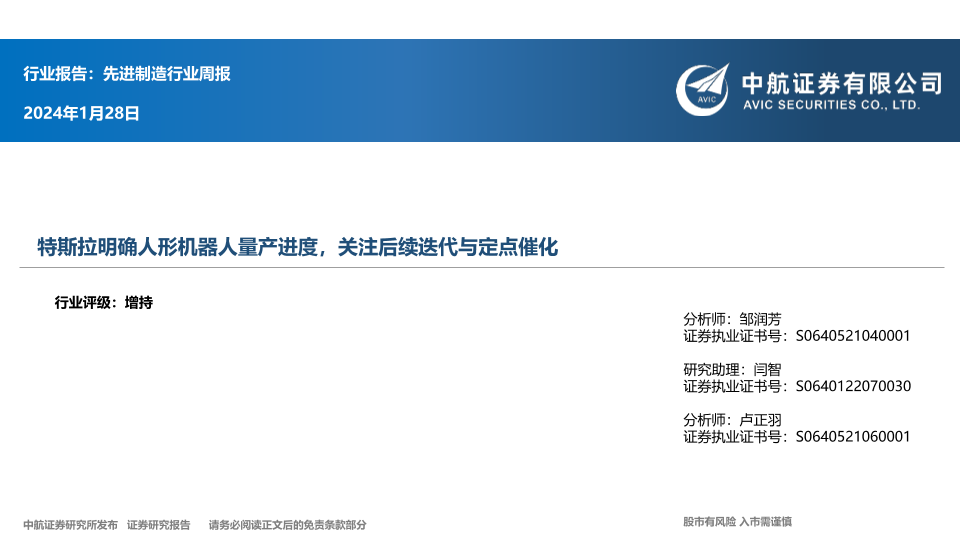【中航证券】【20240128】先进制造行业周报:特斯拉明确人形机器人量产进度,关注后续迭代与定点催化-10页