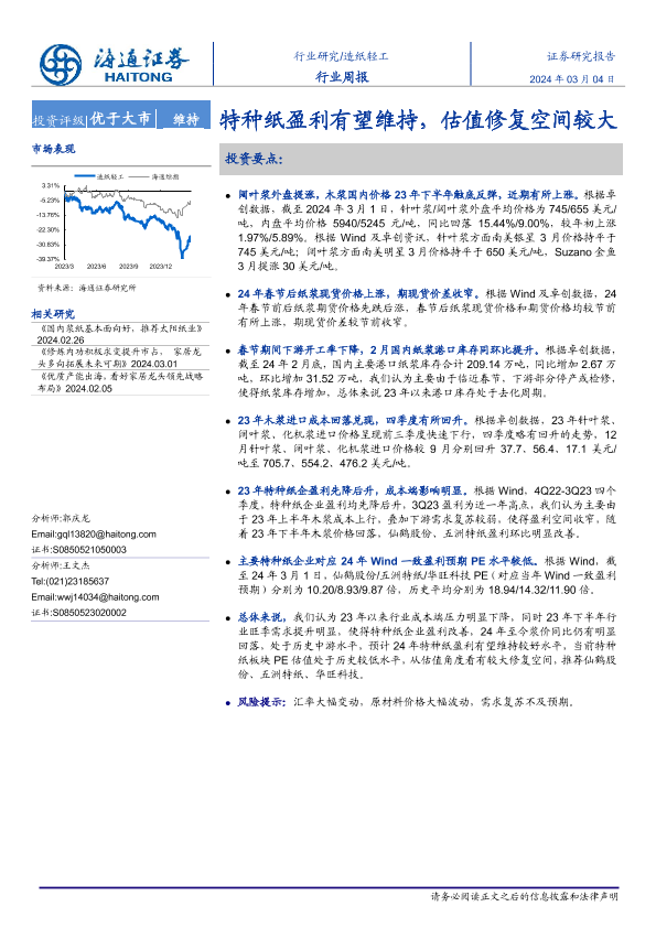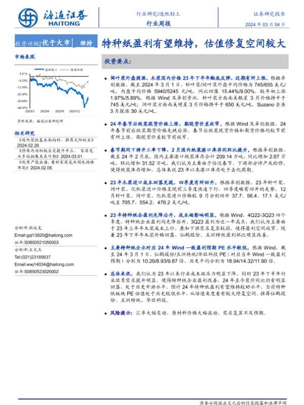 【海通证券】【20240304】20240304-海通证券-造纸轻工行业周报:特种纸盈利有望维持,估值修复空间较大-14页