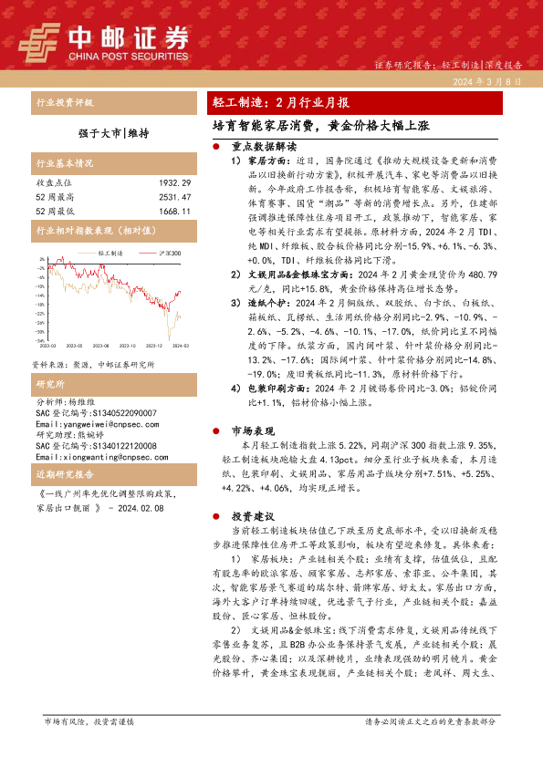 【中邮证券】【20240308】20240308-中邮证券-轻工制造:2月行业月报:培育智能家居消费,黄金价格大幅上涨-20页