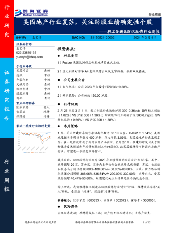 【渤海证券】【20240304】轻工制造&纺织服饰行业周报:美国地产行业复苏,关注纺服业绩确定性个股-12页