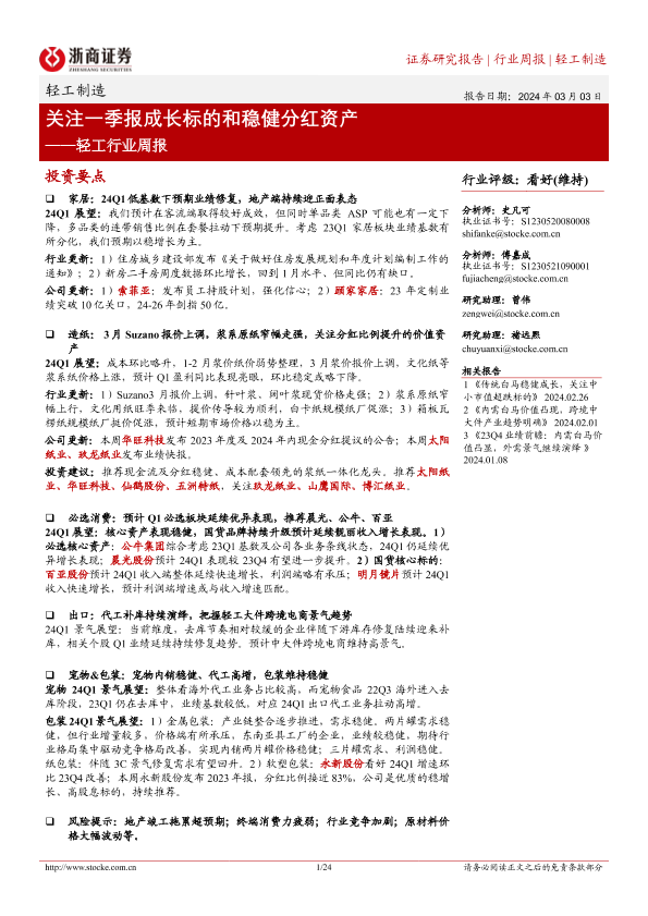 【浙商证券】【20240303】20240303-浙商证券-轻工行业周报:关注一季报成长标的和稳健分红资产-24页