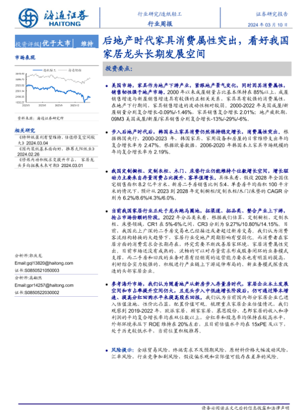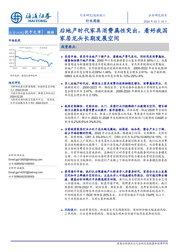 【海通证券】【20240310】20240310-海通证券-造纸轻工行业周报:后地产时代家具消费属性突出,看好我国家居龙头长期发展空间-11页