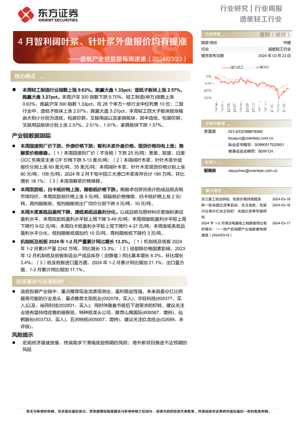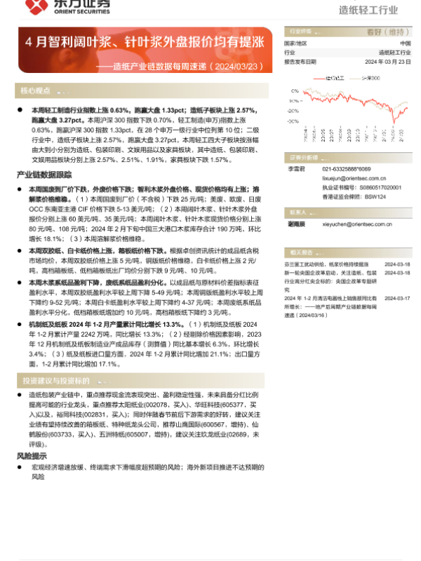 【东方证券】【20240323】20240323-东方证券-造纸产业链数据每周速递:4月智利阔叶浆、针叶浆外盘报价均有提涨-12页
