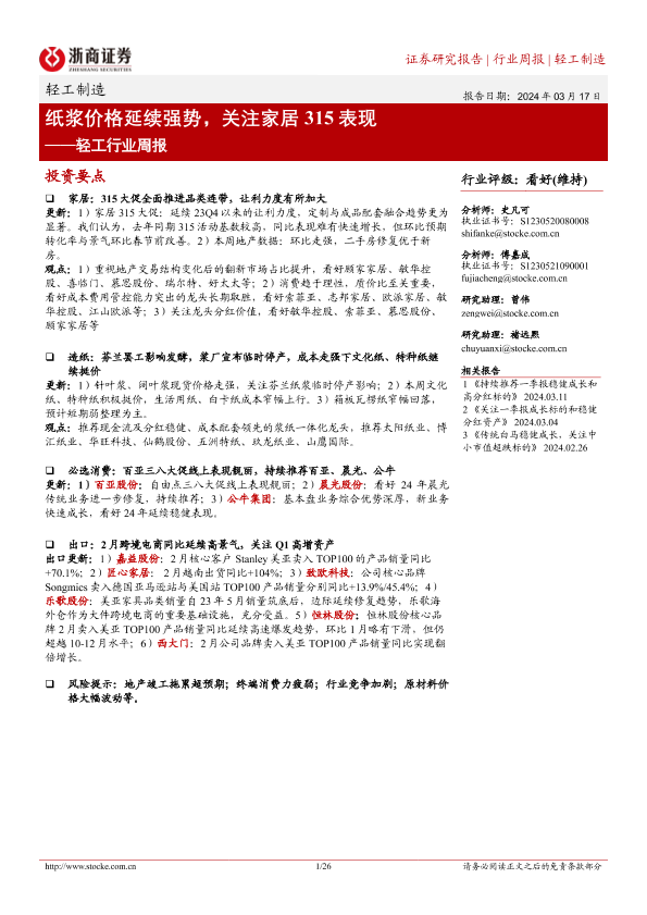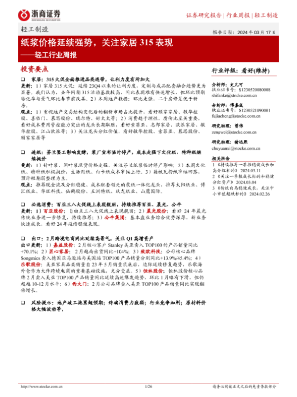 【浙商证券】【20240317】20240317-浙商证券-轻工行业周报:纸浆价格延续强势,关注家居315表现-26页