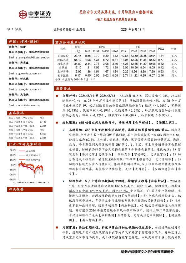 【中泰证券】【20240617】20240617-中泰证券-轻工制造及纺织服装行业周报:关注618大促品牌表现,5月纺服出口数据回暖-33页