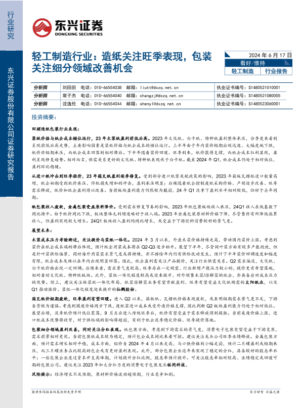 【东兴证券】【20240617】轻工制造行业:造纸关注旺季表现,包装关注细分领域改善机会-12页