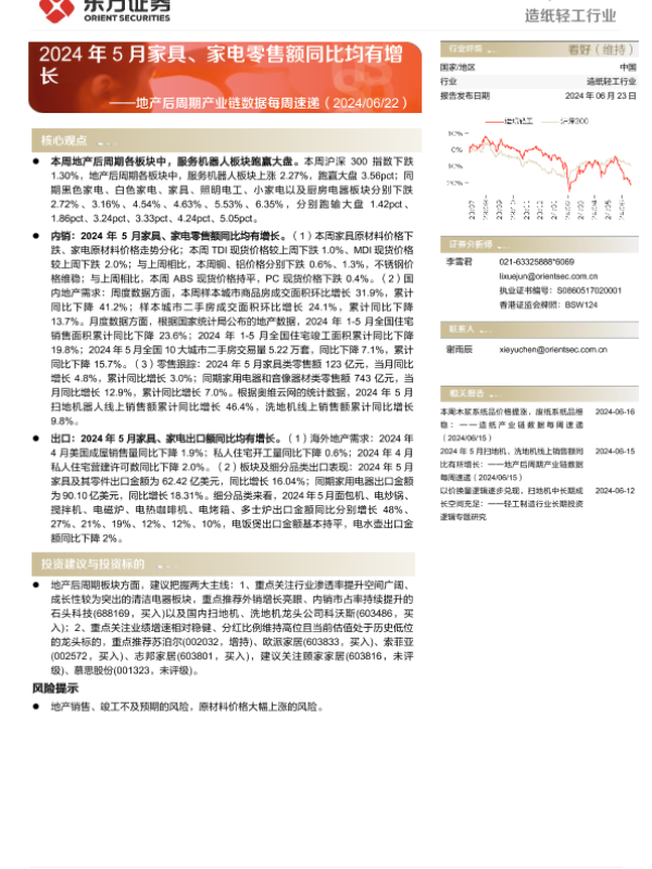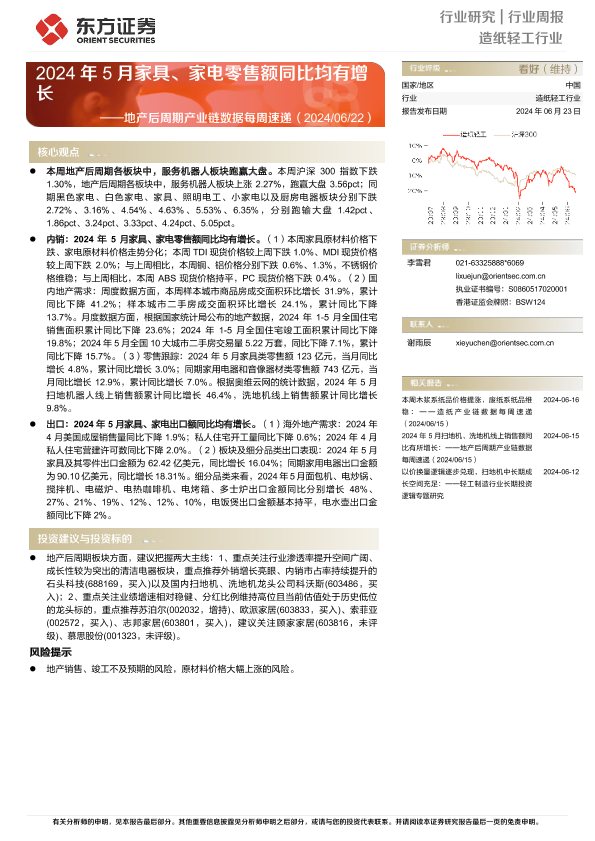 【东方证券】【20240623】20240623-东方证券-造纸轻工行业地产后周期产业链数据每周速递:2024年5月家具、家电零售额同比均有增长-14页