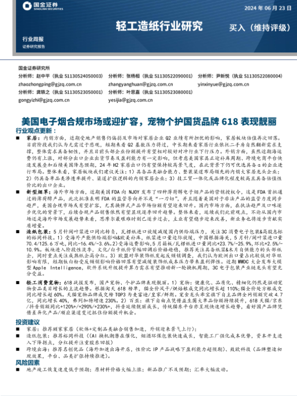 【国金证券】【20240623】20240623-国金证券-轻工造纸行业周报:美国电子烟合规市场或迎扩容,宠物个护国货品牌618表现靓丽-16页