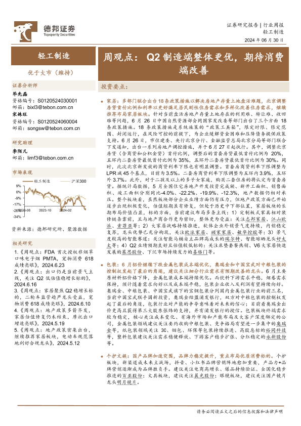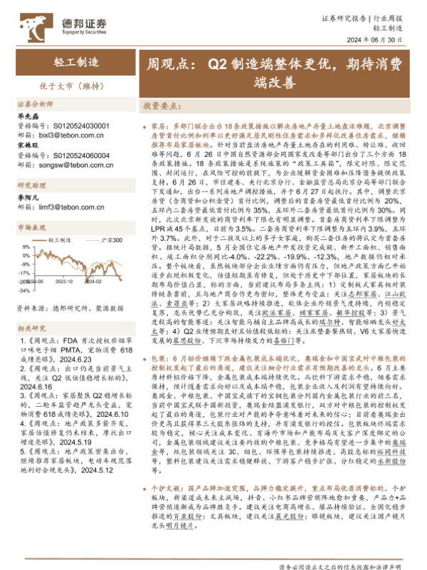 【德邦证券】【20240630】20240630-德邦证券-轻工制造周观点:Q2制造端整体更优,期待消费端改善-14页