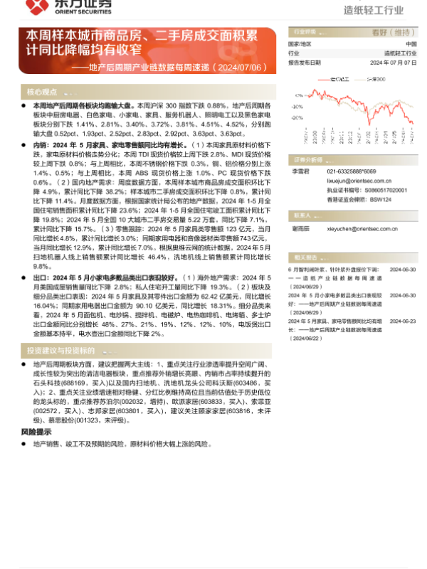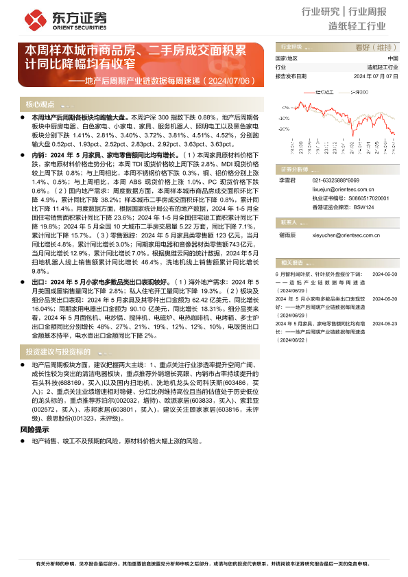 【东方证券】【20240707】20240707-东方证券-造纸轻工行业地产后周期产业链数据每周速递:本周样本城市商品房、二手房成交面积累计同比降幅均有收窄-15页